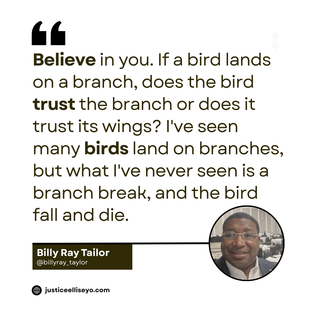 “Believe in you. If a bird lands on a branch, does the bird trust the branch or does it trust its wings? I’ve seen many birds land on branches, but what I’ve never seen is a branch break, and the bird fall and die.”