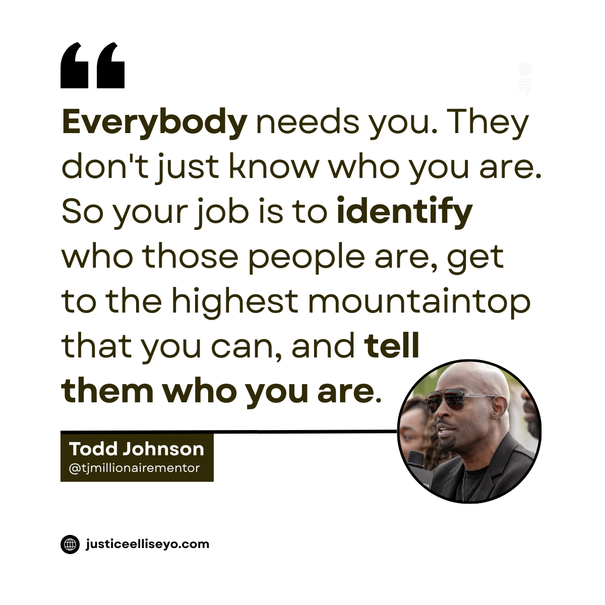 Todd Johnson says, “Everybody needs you. They don’t just know who you are. So your job is to identify who those people are, get to the highest mountaintop that you can, and tell them who you are.”