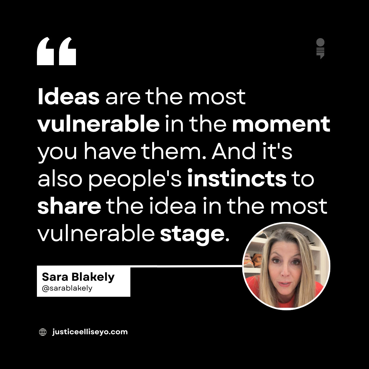 Sara Blakely says, “Ideas are the most vulnerable in the moment you have them. And it’s also people’s instincts to share the idea in the most vulnerable stage.”